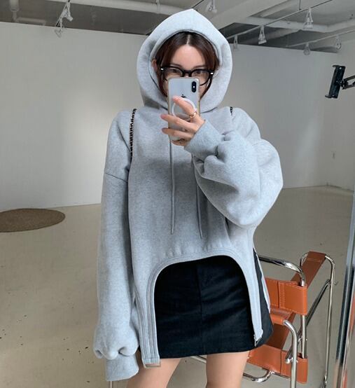 スウェット トレーナー アシンメトリー 長袖 切り替え 体型カバー 着痩せ 帽子付き シンプル カジュアル パーカー カットソー 不規則 フード付