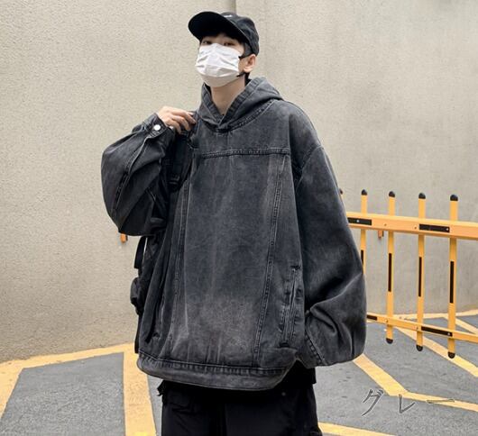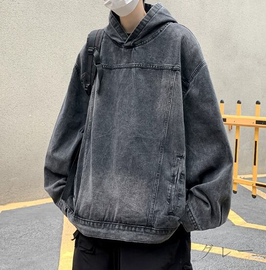 スウェット トレーナー 長袖 切り替え 体型カバー 着痩せ デニム 帽子付き 原宿系 パーカー カットソー フード付