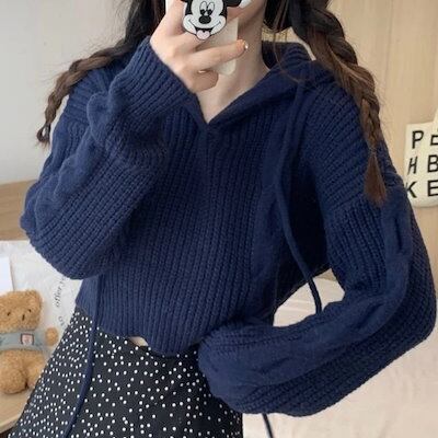2025春秋 大人気!パーカー ニット セーター フード付き Vネック 韓国ファッション レディース おしゃれ かわいい カジュアル お出かけ丈短め 長袖 春 白 紺 緑 紫