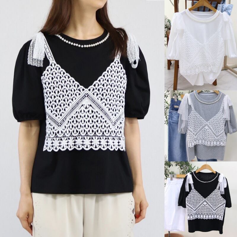 初回送料無料 新品Tシャツ 半袖フェイク2枚ブラウス オシャレ上着 人気トップス