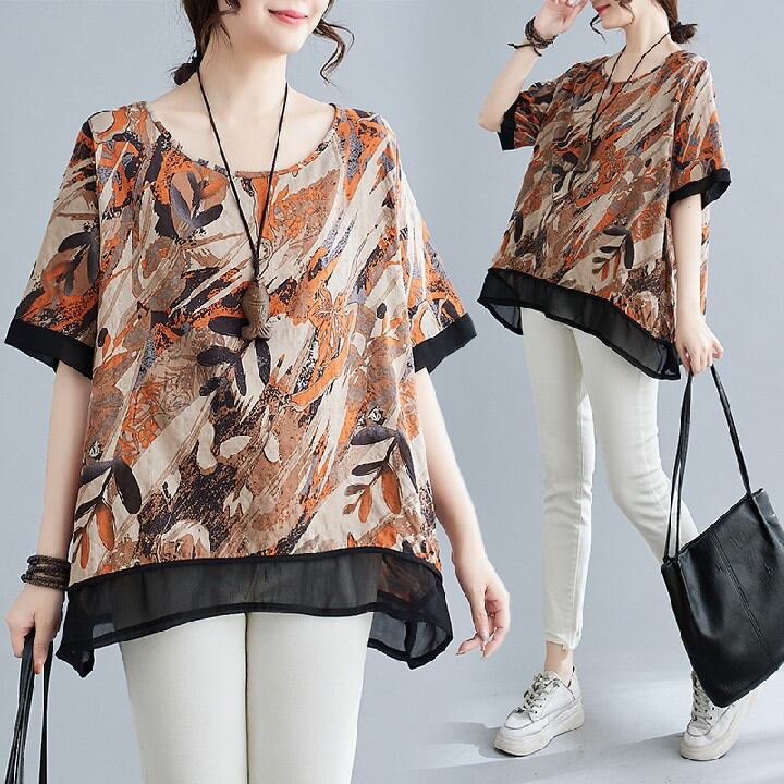 初回送料無料 夏レディースファッション カジュアル ゆったり プリント 半袖ブラウス トップス