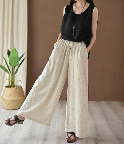 ワイドパンツ レディース きれいめ 大きいサイズ パンツ おしゃれ 綿麻風 夏 前垂らし ひんやり ロングパンツ 春夏秋 無地 レディース ボトムス イージーパンツ 体型カバー ストレートパンツ 着痩 | HUG-L