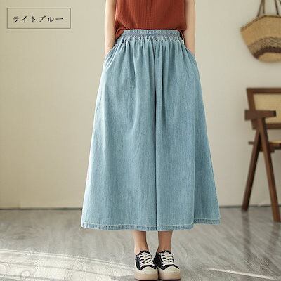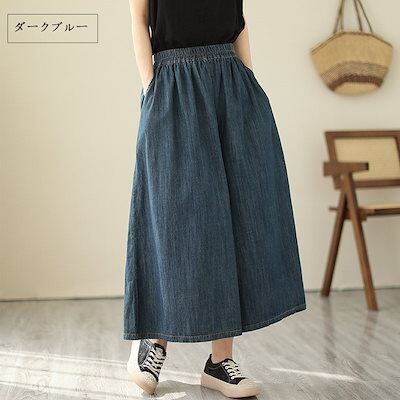 ワイドパンツ デニム パンツ レディース ワイド デニムパンツ 春 夏 ガウチョパンツ ロング 9分丈 ガウチョ パンツ スカーチョ ボトムス 大きいサイズ ロングパンツ ハイウエスト ウエストゴム | HUG-L