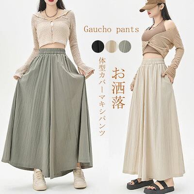 ワイドパンツ パンツ フレア 夏 レディース マキシ ロングパンツ ガウチョパンツ 春 ボトムス パンツ ロング丈 ウエストゴム ガウチョ ワイド 無地 体型カバー 揺れる 薄手 綺麗め ハイウエスト | HUG-L