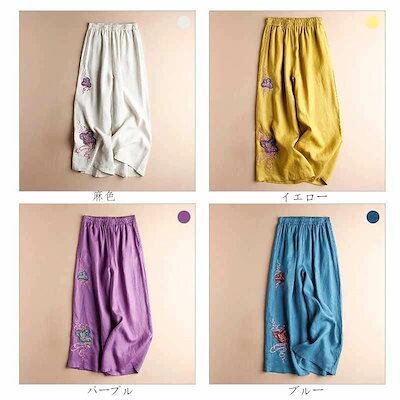 ワイドパンツ レディース パンツ 綿麻 リネン ガウチョパンツ 春夏 リネンパンツ パンツ ハイウエスト きれいめ ボトムス 刺繍 花柄 スカーチョ ガウチョ リネン 大きいサイズ ロングパンツ ゆっ | HUG-L