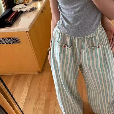 ワイドパンツ レディース 夏 ガウチョパンツ マキシ丈 ストライプ柄 ロングパンツ 薄手 イージーパンツ ストライプパンツ ボトムス ワイド ロング ズボン ウエストゴム ポケット付き 大きいサイズ | HUG-L