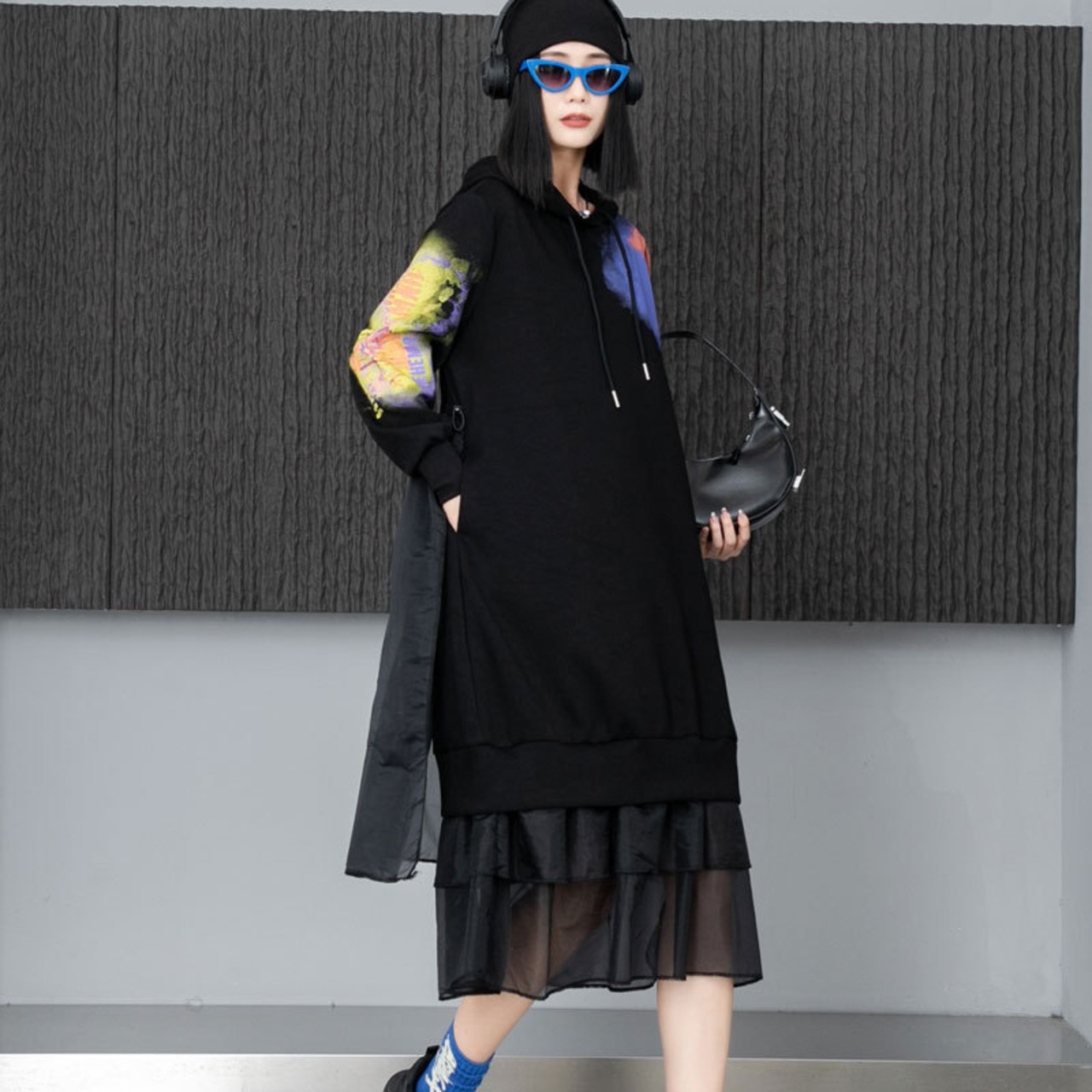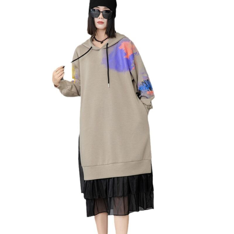 初回送料無料 新作レディースファッション フェイク2枚 パーカー風 フード付き 長袖ワンピース