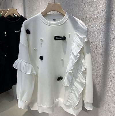 パーカー レディース 秋 冬 春 チュニック トップス フリル フレア 長袖 可愛い 花柄 刺? 切替 シンプル きれいめ カジュアル レディースパーカー ノーマル丈 ロング丈 ブラック 体型カバー | HUG-L