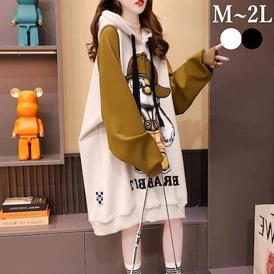 パーカーワンピース フード付き スウェット トレーナー ロゴ プリント ロングパーカー ワンピ カジュアル ミディアム ロング ビッグシルエット 大きいサイズ レディース 春 秋 M L 2L | HUG-L