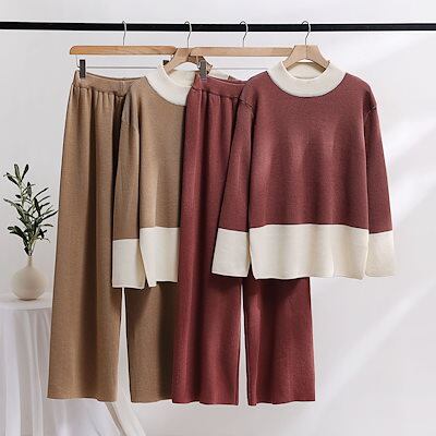 ニットセットアップ 2点セット パンツ レディース 秋 冬 長袖 ニットパンツ ワイドパンツ クルーネック セータートップス 上下セット 大人カジュアル シンプル ゆったり可愛い おしゃれ 着痩せ き