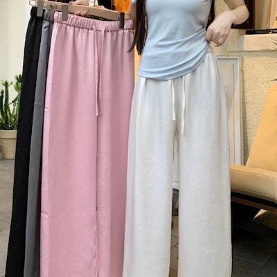 2025 春夏パンツ ロング丈 ウエストゴム ワイド ストレート ハイウエスト 美脚効果 脚長効果 細見え 夏 白 黒 おしゃれ かわいい 韓国ファッション レディース お出かけ30%までに制限