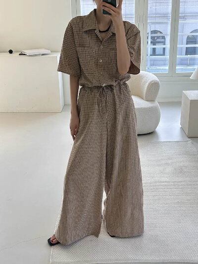 オールインワン レディース チェック柄 ワイドパンツ オーバーオール 春 夏 秋 半袖 ゆったり 体型カバー 女性 お呼ばれ 可愛い ワイドシルエット 大きいサイズ シンプル おしゃれ ゆったり カジ | HUG-L