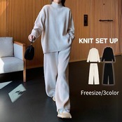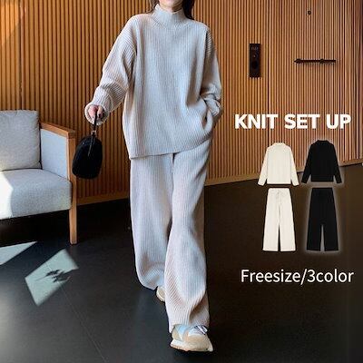 ニットセットアップ レディース パンツセットアップ 秋冬 上下セット タートルネック 長袖 ゆったり 無地 厚手 プルオーバー ワイドパンツ ウエストゴム ニットセットアップ 可愛い お洒落 カジュア | HUG-L