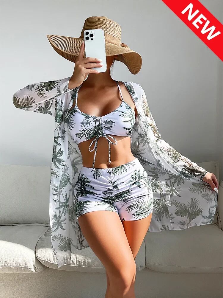 女性のためのトロピカルロバープリントビキニ、ギャザーカバーアップ水着、長袖水着、ビーチウェア、スーツ、ひも、3パック、2024 ビキニ Tシャツ T240619004110_06