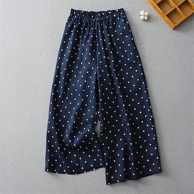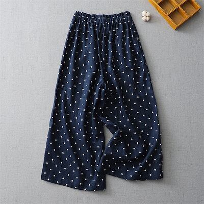 ドット ワイドパンツ 綿麻風パンツ レディース パンツ 夏 水玉柄 ワイドパンツ リネン混 パンツ ボトムス 大人カジュアル 春夏 ナチュラル 森ガール ズボン ウエストゴム 大きいサイズ ゆったり | HUG-L