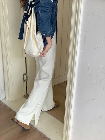 ニットパンツ レディース リブパンツ ワイドパンツ サイドスリット 4色 秋 冬 春リブ ウエストゴム ガウチョパンツ ハイウエスト ストレートパンツ 暖かい プリーツパンツ リブニット パンツ 無地 | HUG-L