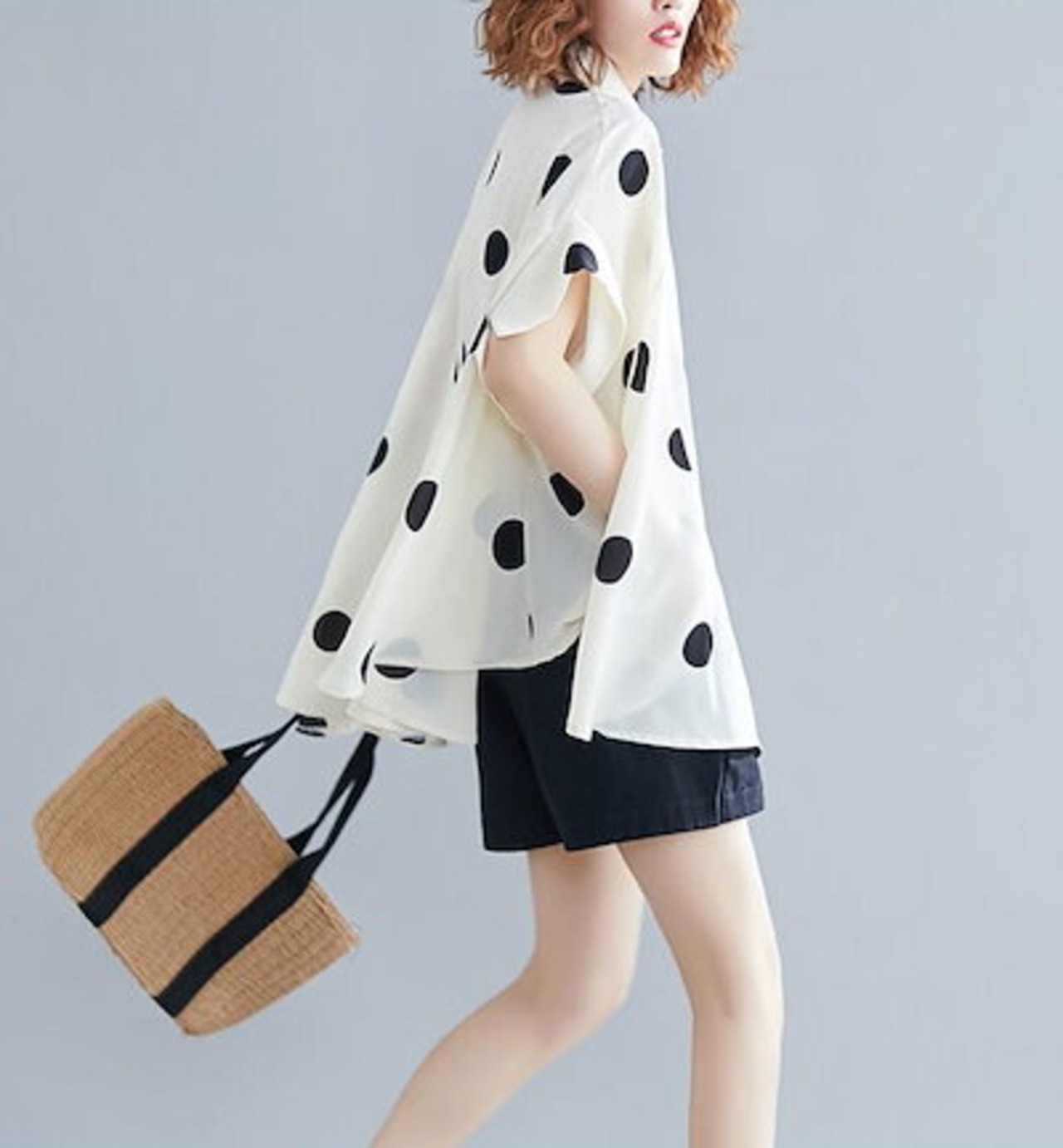 メガ割-ドルマン フィッシュテール ドット 水玉柄 前後差 フリル シャツ ブラウス フリルブラウス トップス レディース 半袖 大きめ 大きいサイズ 立ち襟 体型カバ ゆったり 涼しい カジュアル | HUG-L