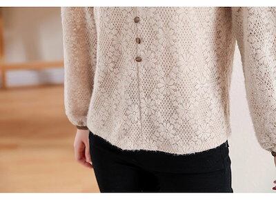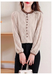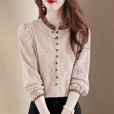 レースブラウス レディース 長袖 総レース ブラウス 前ボタン 花柄 トップス シャツブラウス 襟フリル 秋冬 インナー お洒落 可愛い カジュアル フォーマル オフィス ゆったり エレガント 大きい | HUG-L
