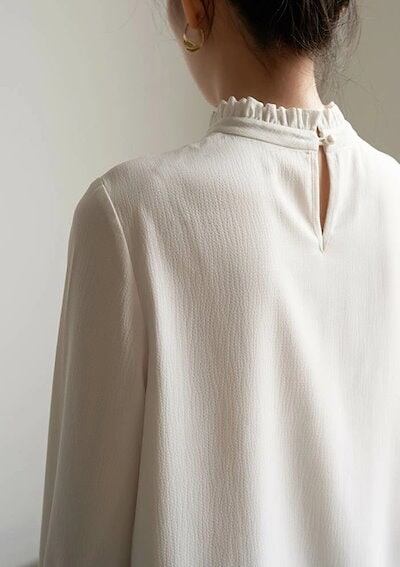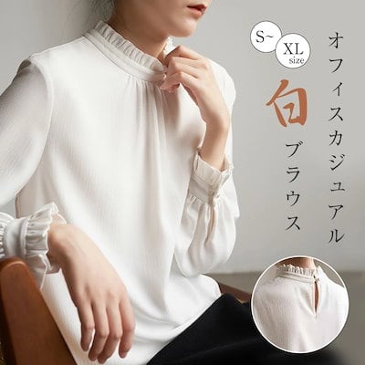 ブラウス レディース 長袖 襟フリル シャツブラウス スーツインナー 白シャツ トップス 袖フリル フォーマル 無地 ホワイト 白 オフィス ビジネス お洒落 通勤 ワイシャツ カジュアル OL おし | HUG-L