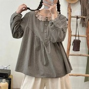 ブラウス ギンガムチェック ブラウス レース襟ブラウス レディース 長袖 コットン チェック柄 チュニックブラウス レース襟 大きいサイズ 長袖Tシャツ プルオーバー トップス ゆったり カジュアル | HUG-L