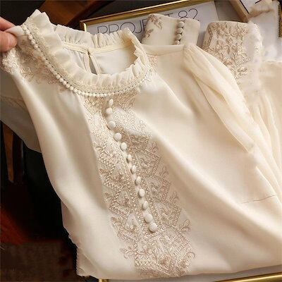 フリル襟ブラウス 光沢感 レディース 長袖 刺繍ブラウス シフォン 花柄刺繍 華やか トップス スーツインナー フリル襟 通勤 オフィス 仕事 OL おしゃれ 大人可愛い ゆったり カジュアル フォー | HUG-L