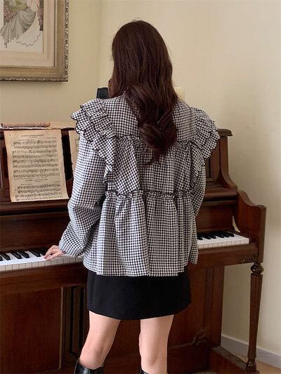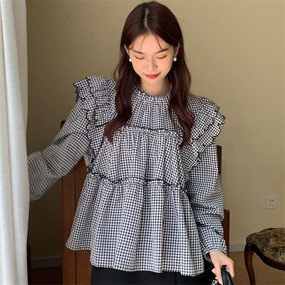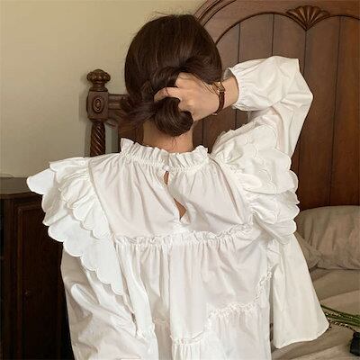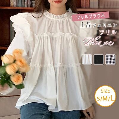 シャツ ブラウス レディース トップス 肩フリル 無地 長袖 春 秋 冬 上品 華やか 体型カバー 高見え 二の腕カバー フリル ティアード フリルネック 立ち襟 ギャザー ゆったり フェミニン ぽっ | HUG-L