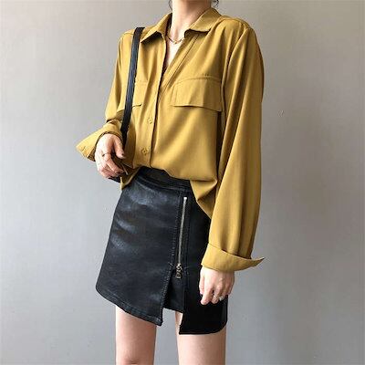 オフェスシャツ ブラウス レディース 長袖 チュニック トップス 折り襟 前開き オフェス フォーマル きれいめ シンプル お洒落 大人 ビジネス 通勤 オフィス OL 無地 ショート丈 とろみ 体型カバー | HUG-L