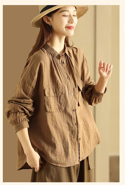 シャツ レディース 長袖 春秋 おしゃれ ダブルガーゼ ガーゼシャツ 折り襟 トップス ブラウス 羽織 ゆったり 体型カバー きれいめ 抜き襟 オーバーサイズ フォーマル オフィス 通勤 着やせ 前開 | HUG-L