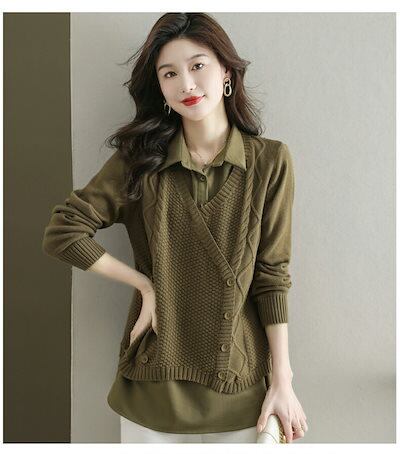 ニット セーター レディース シャツブラウス フェイクレイヤード トップス 秋 冬 長袖 シャツ プルオーバー ニットソー 切り替え ドッキング ニット レイヤード風 重ね着風 シャツ襟 上着 無地 | HUG-L