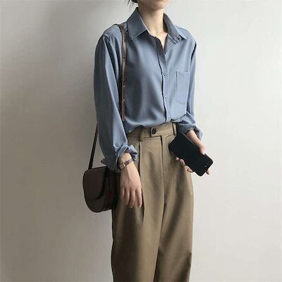 オフェスシャツ ブラウス レディース 長袖 チュニック トップス 折り襟 前開き オフェス フォーマル きれいめ シンプル カーディガン お洒落 大人 ビジネス 通勤 オフィス OL 無地 ショート丈 とろ | HUG-L