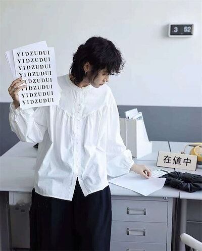 シャツ レディース 長袖 半袖 立ち襟 白 お洒落 ブラウス ポワン袖 前開き オフィス 春 トップス きれいめ 大人 カジュアル シンプル 体型カバー 大きいサイズ ゆったり 通勤 20代 30代 | HUG-L
