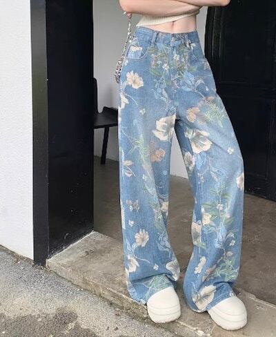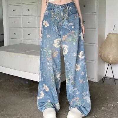 ガーリー キュート 細見え 2024 おしゃれ ロング丈 かわいい 韓国ファッション 春夏パンツ ストレート 脚長効果 夏 美脚効果 ワイド お出かけ ジーンズ デニム ハイウエスト 花柄 レディース | HUG-L