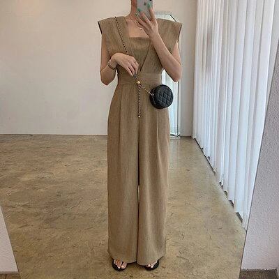オールインワン レディース Vネック サロペット ワイドパンツ 春夏 きれいめ エレガント 美シルエット 着痩せ 体型カバー シンプル かわいい 美脚 無地 ゆったり おしゃれ カジュアル コーデ ス | HUG-L