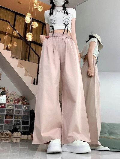 メガ割 24 パンツ ロング丈 モップパンツ ワイド ストレート ウエストゴム ハイウエスト 美脚効果 脚長効果 細見え 黒 水色 白 緑 韓国ファッション レディース かわいい おしゃれ カジュ | HUG-L