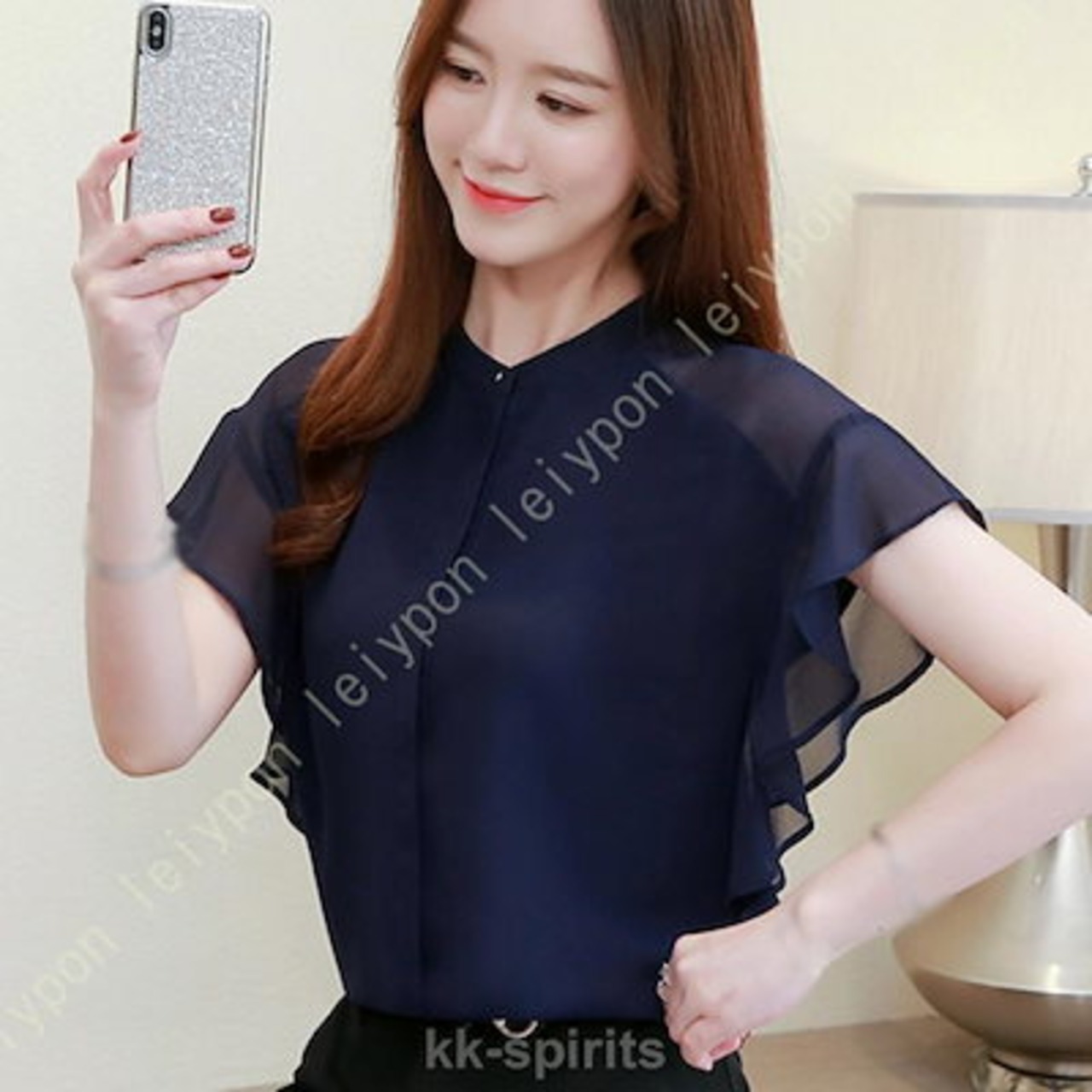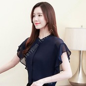 白 シフォン ブラウス 二の腕カバー フレア袖 スリーブ 半袖 カットソー レディース S2XL ワイシャツ レディース 就活 シャツ レディース 襟なし ブルー