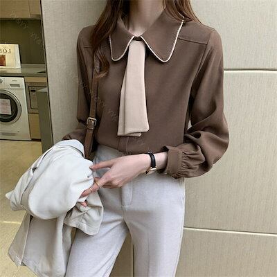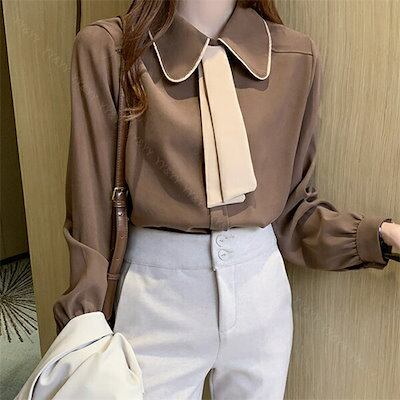 ブラウス 長袖 かわいい レディース トップス ボウタイ バイカラーリボン 無地 コンパクト シンプル インナー デイリー オフィス 春 夏 秋 韓国ファッション カットソー 大人 M | HUG-L