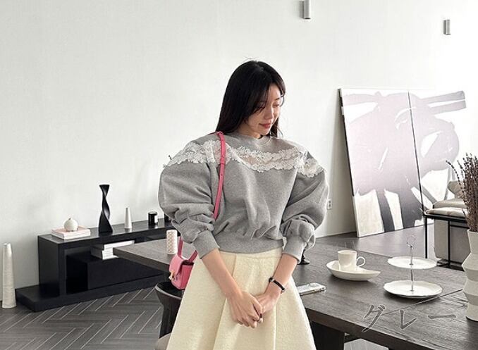 全2色 スウェット トレーナー 長袖 切り替え 体型カバー 着痩せ レース シンプル