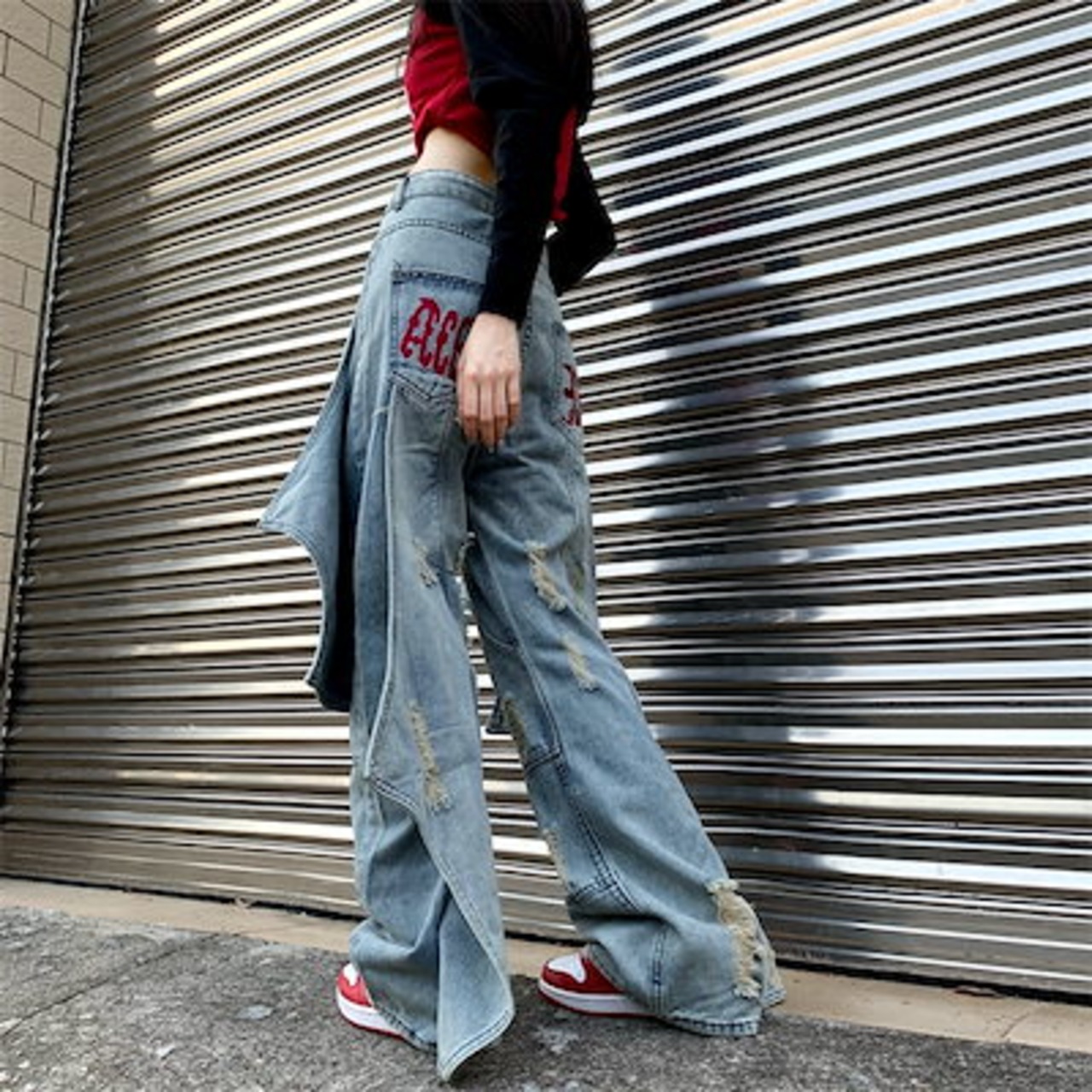 2024春夏 4XL展開 ワイド デニムパンツ ボトムス ストレート パンツ ロゴ ズボン ファッション系加工韓国 レディース カジュアル パッチワーク 学生 スタイルアップ 色っぽ 女っぽ | HUG-L