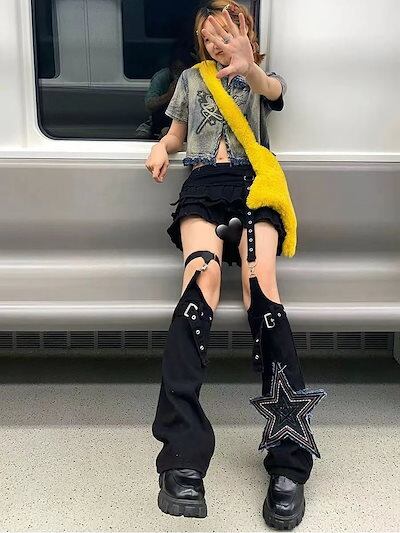 ワイドパンツ モップパンツ ブラック あしの長いカバー ダメージデニムパンツ Y2K
