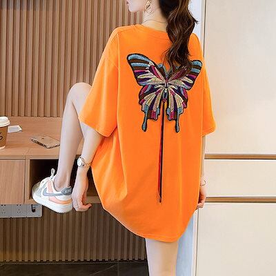 Tシャツカットソー Tシャツ レディース リボン刺繍 tシャツ 半袖 レディース 韓国ファッション ラウンドネックトップス ゆったりカジュアル 夏服 百掛けロングTシャツ 大きいサイズ Tシャツ | HUG-L