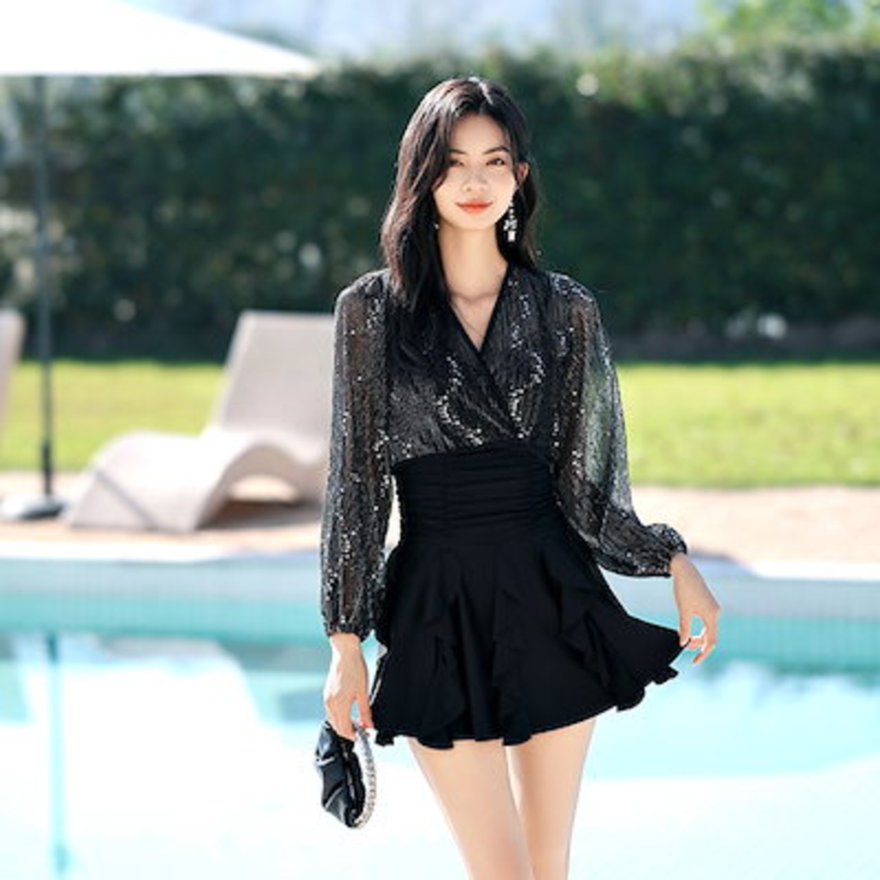 可愛い水着オールインワンレディース水着ワンピース長袖水着女性ワンピース式保守的にお腹を隠して痩せている新型夏海辺休暇水着2点セット