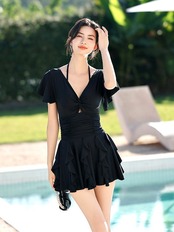 可愛い水着オールインワンレディース韓国ワンピース水着女性保守純色小清新痩せスカート式温泉水着
