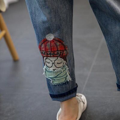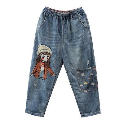 【】漫画ガール ワッペン 刺繍 ジーンズ レディース ゆったり 大きいサイズ ビッグポケット ウエストゴム ハーレムパンツ