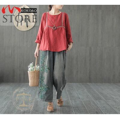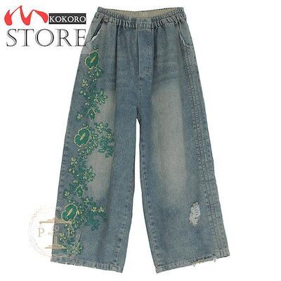 ロングパンツ レディース 春 ジーンズ デニムパンツ 刺繍 ゆったりパンツ ワイドパンツ 着痩せ おしゃれ