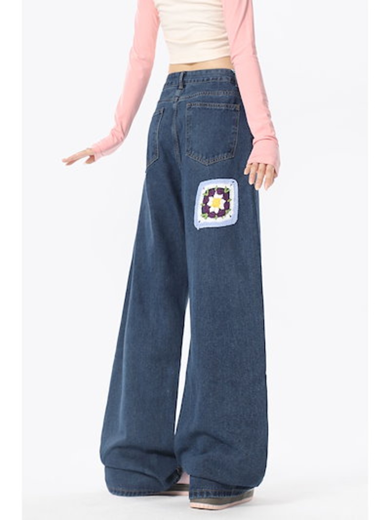 ブルージーンズ レディース 刺繍 ハイウエスト ルーズストレート カジュアル ワイドレッグ ロングパンツ