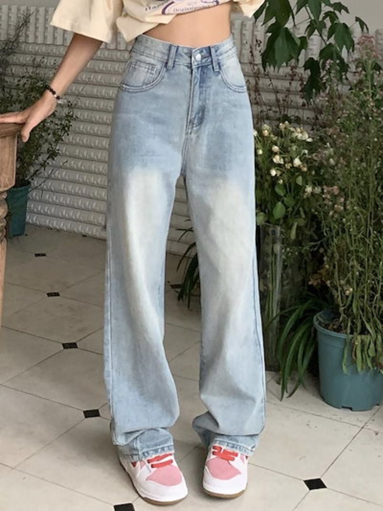 ハローキティ刺繍ジーンズレディースハイウエストルーズストレートワイドレッグパンツ