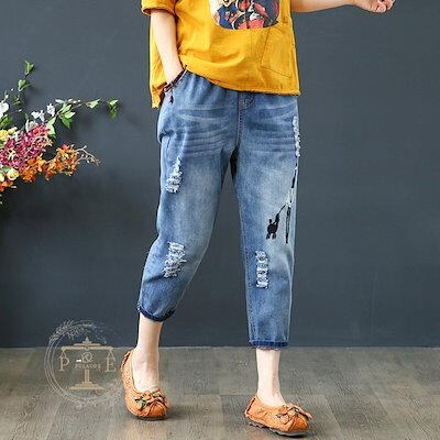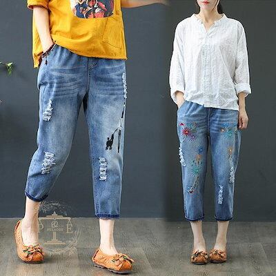 ジーンズ レディース 刺繍 花 フラワー イージーパンツ 七分丈 クロップド デニムパンツ ウォッシュ ダメージ