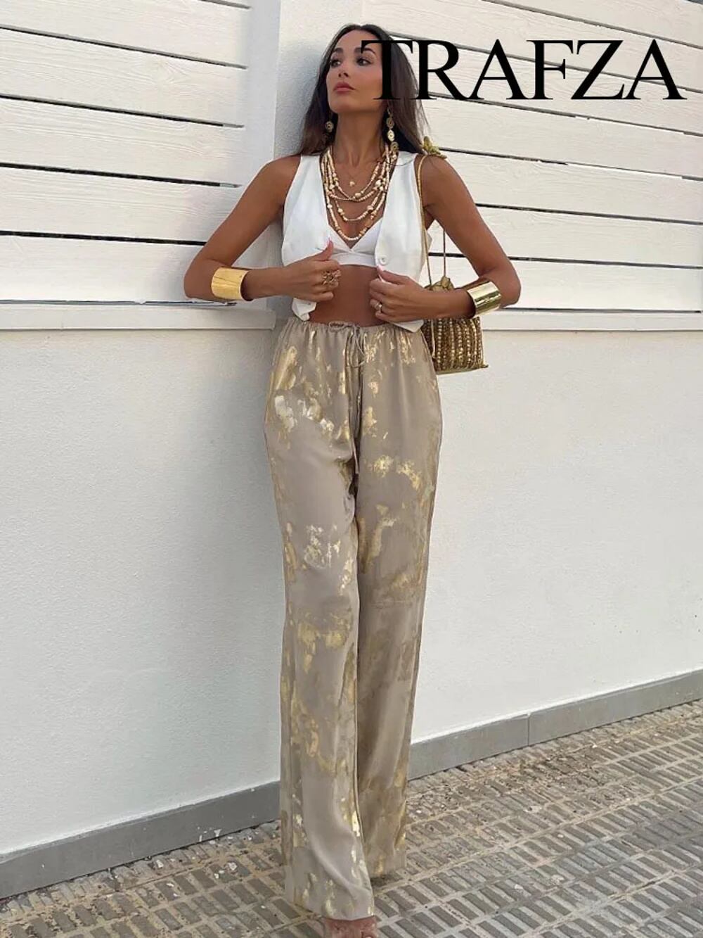 Trafza-女性用ハイウエストメタルプリントバギーパンツ,ドローストリング付きバギーロングパンツ,ルーズフィットストリートウェア,ファッショナブル,y2k,2023 ボトム ワイドレッグ バギーパンツ T240831223750_01 | HUG-L
