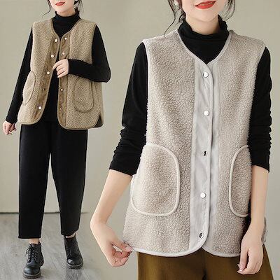 ラムズウール ノースリーブ 秋冬 ゆったり プラッシュ ベスト シンプル ふわふわ トップス アウター 裏起毛 厚手 ショット丈 防寒 ウォームウォーム ラムズフリース