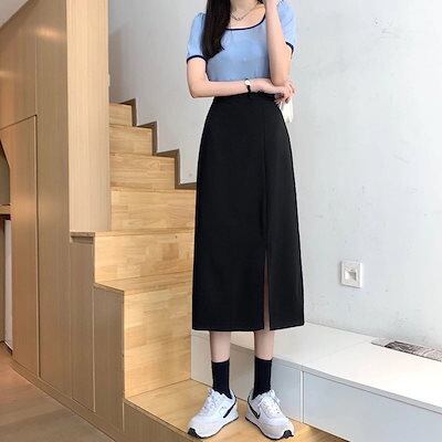 韓国ファッション レディースタイトスカート ハイウエストミディアムスカート着痩せ ロングスカート